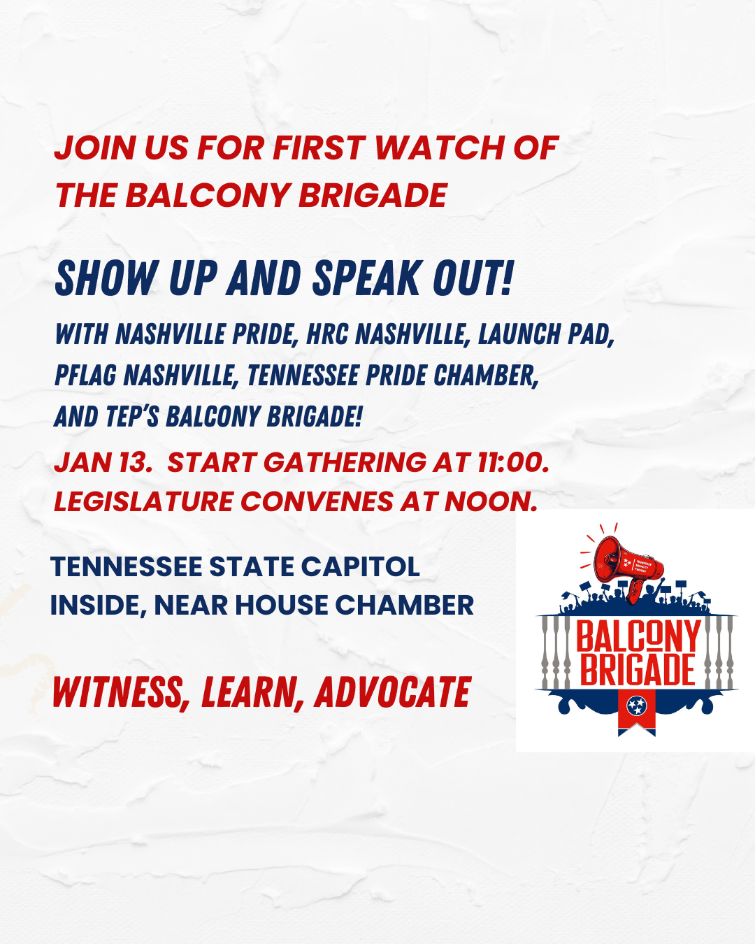 Show up and speak out with Nashville Pride, HRC Nashville, Launch Pad, PFLAG Nashville, Tennessee Pride Chamber and TEP's Balcony Brigade. Legislature convenes at noon, so we'll start gathering at 11:00AM inside the Tennessee State Capitol, near the house chamber.