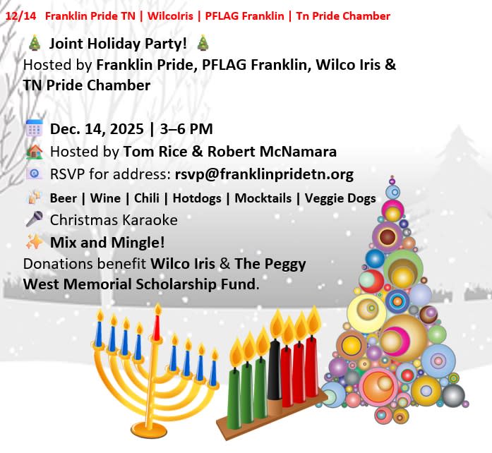 Celebrate the season with our friends at Franklin Pride, PFLAG Franklin, and Wilco Iris at a joyful community Holiday Party on December 14!