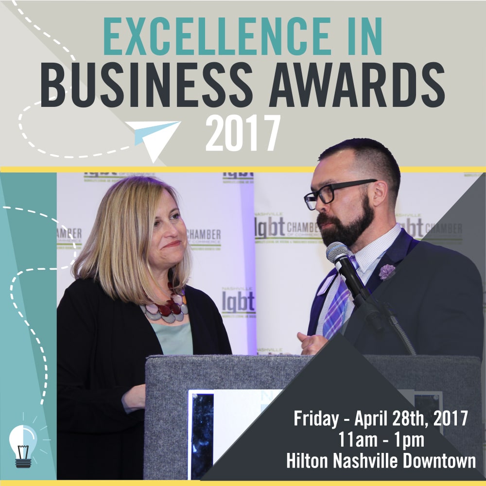 Nashville LGBT Chamber CEO, Lisa Howe, said about the event, “The Excellence in Business Awards is an inspirational day for the LGBT Chamber and our community. This unique and exciting lunch event spotlights the LGBT and ally professional community like no other. All of our nominees deserve to have their stories shared and heard. We do our best to get these LGBT-inclusive stories and accomplishments in front of a powerful audience.”